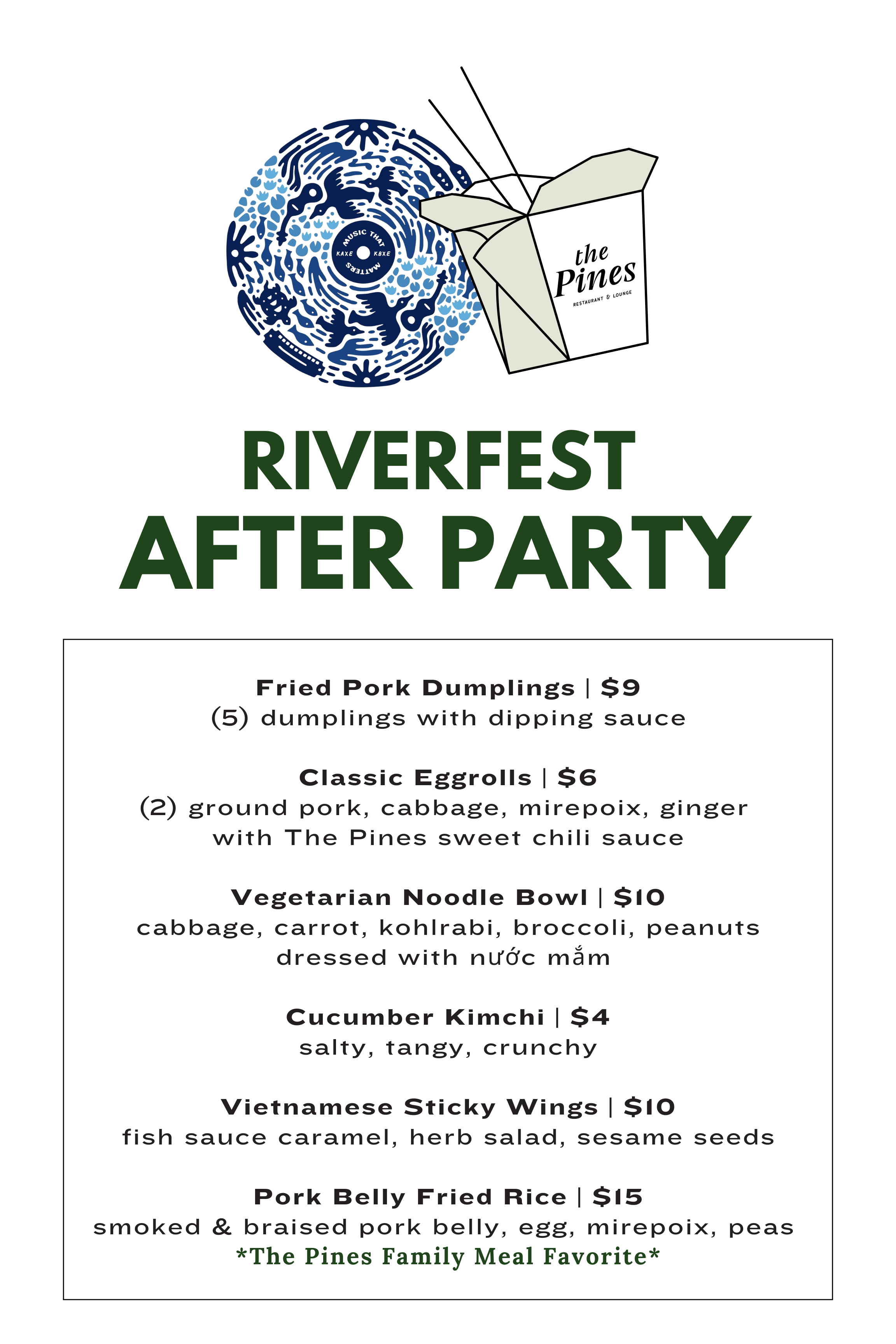 Join us after Riverfest for a late-night celebration at The Pines! We will have a pop-up bar on our patio again! All three bars will be open until 1am—the patio pop-up, the main bar, and The Understory cocktail lounge. Enjoy late-night takeout featuring Asian street food, and sip a specialty cocktail while you relax and wind down the night.